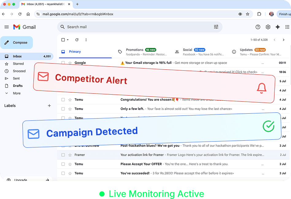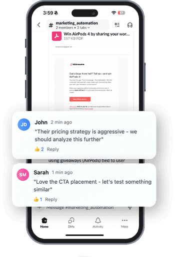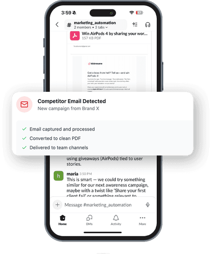 The moment a competitor sends a marketing email, we’ll share it instantly with your team on Slack, Teams, or whatever platform you use — so you’re always one step ahead.